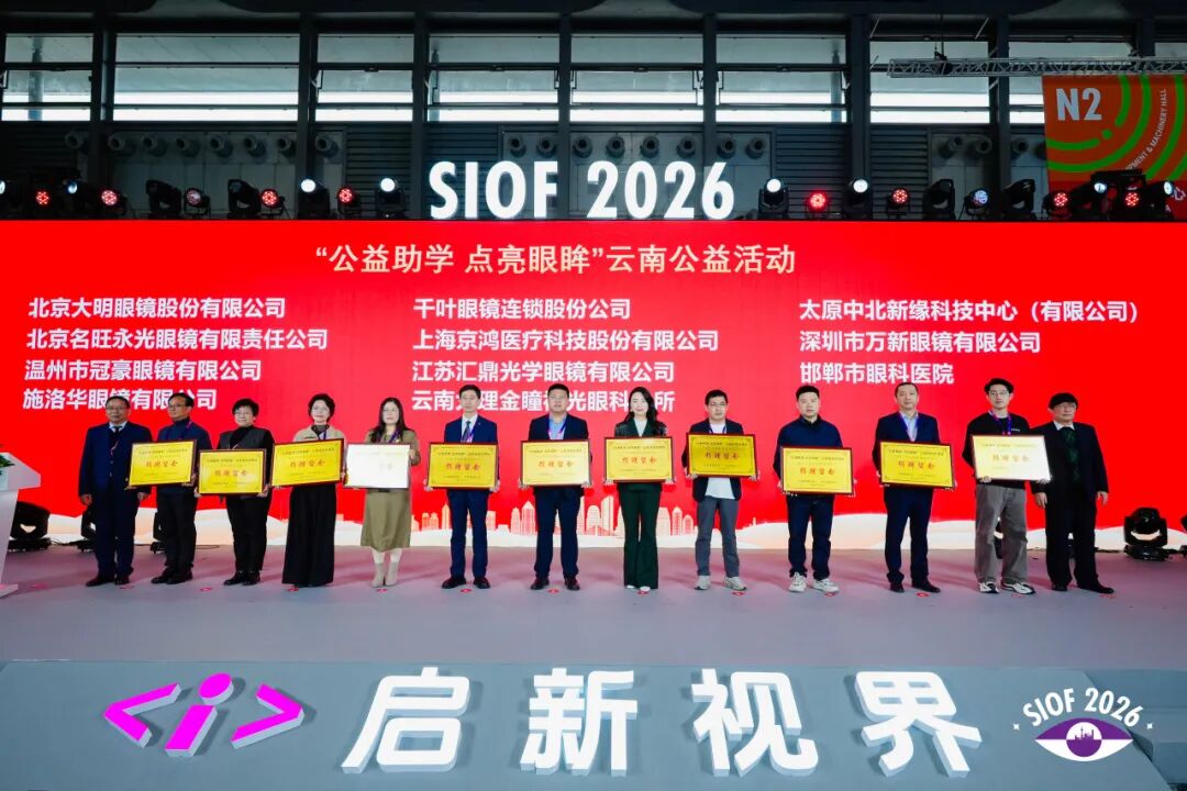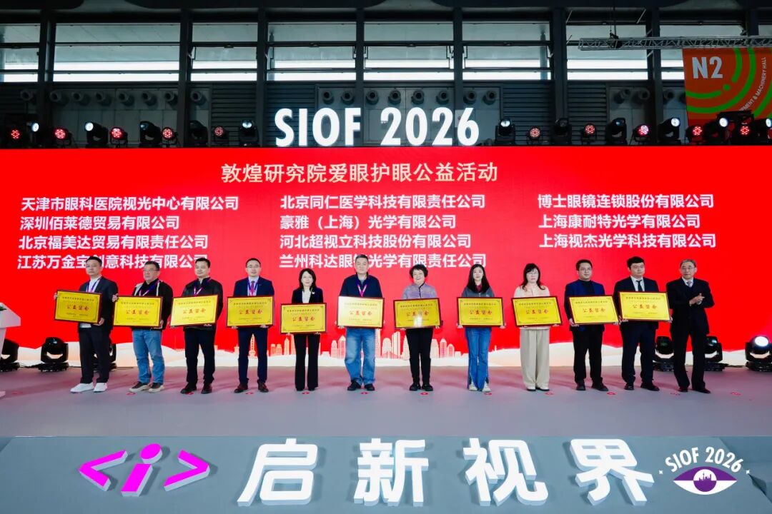 开幕式上为荣获2025年度中国轻工业联合会科技进步奖二等奖的浙江伟星光学股份有限公司和杭州光粒科技有限公司颁发证书。并对2025年积极参与敦煌研究院爱眼护眼公益活动和“公益助学 点亮眼眸”云南公益活动的企业进行了表彰,感谢他们在推动眼健康科普与公益助学方面作出的贡献,并倡导更多企业加入中国眼镜公益行动。
